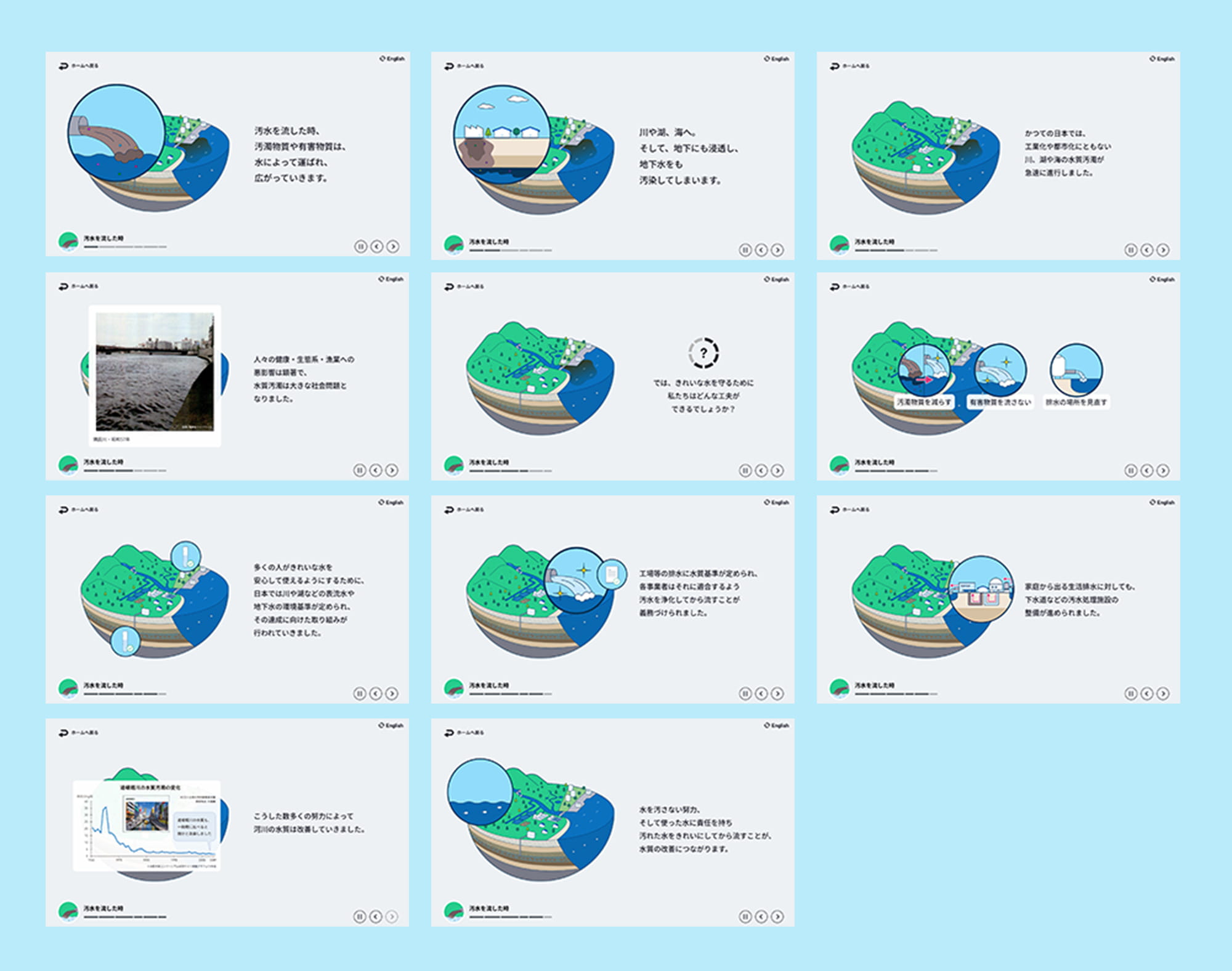 また、「汚水を流した時」「地下水をくみ上げすぎた時」「気温が上昇し続けた時」の3つのケースから、水循環の不健全化の状態や事例を見ることができます。コンテンツの途中には「改善に向けた問いかけ」を配置し、水循環を“自分ごと化”して理解できるストーリー構成としました。
