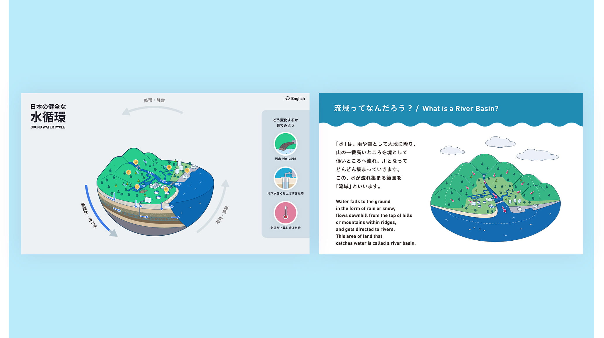 「蒸発・蒸散」→「降雨・降雪」→「表流水・地下水」という水循環の流れを、直感的に理解ができるように動きのあるコンテンツで紹介。