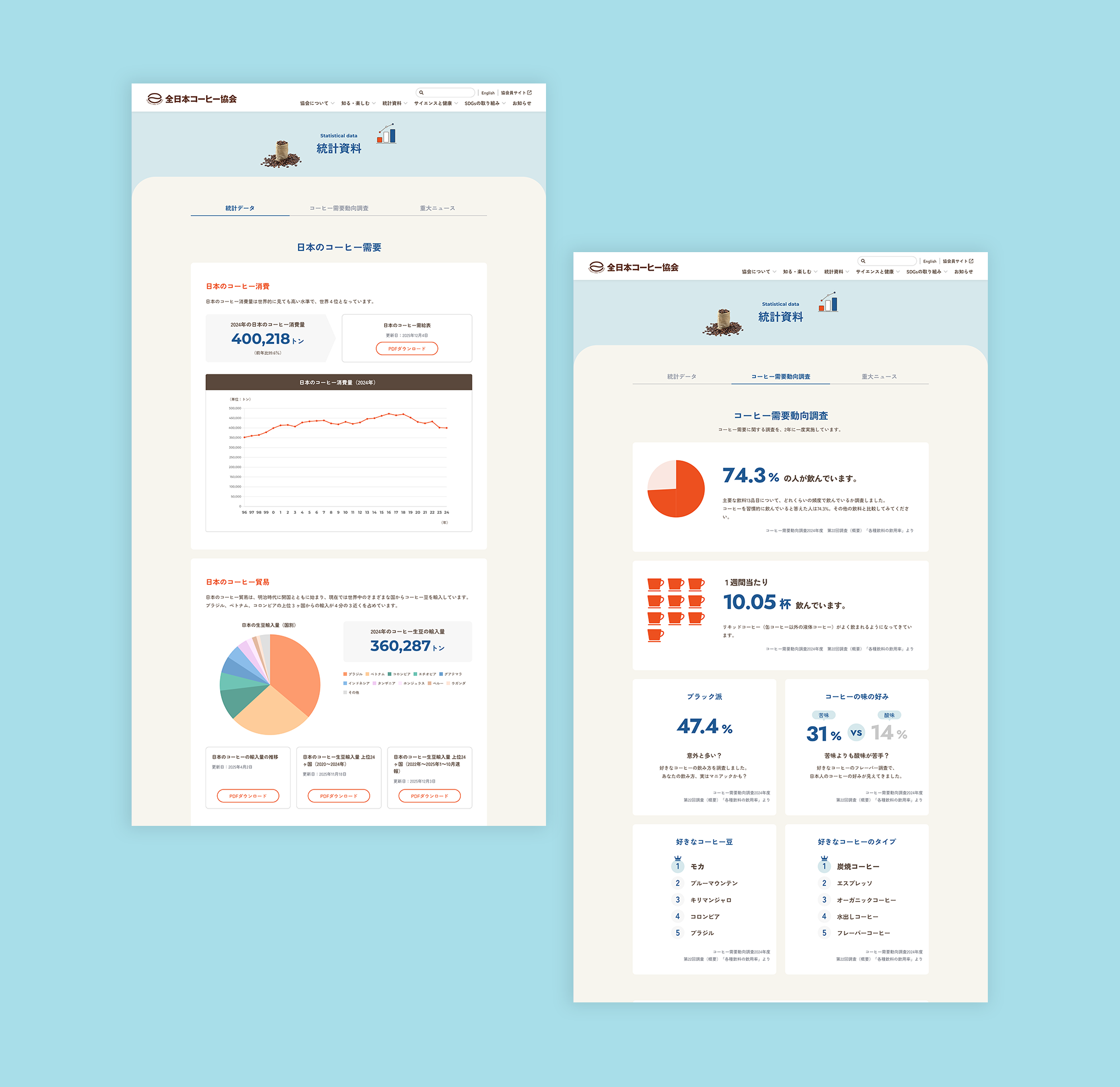 全日本コーヒー協会では、コーヒーに関する国内や海外の需要や供給の推移など、さまざまな統計データを発信しています。PDFでアップされるそれらの情報を視覚的に伝えるために、数字やグラフを使ってわかりやすく見せるデザインを考えました。