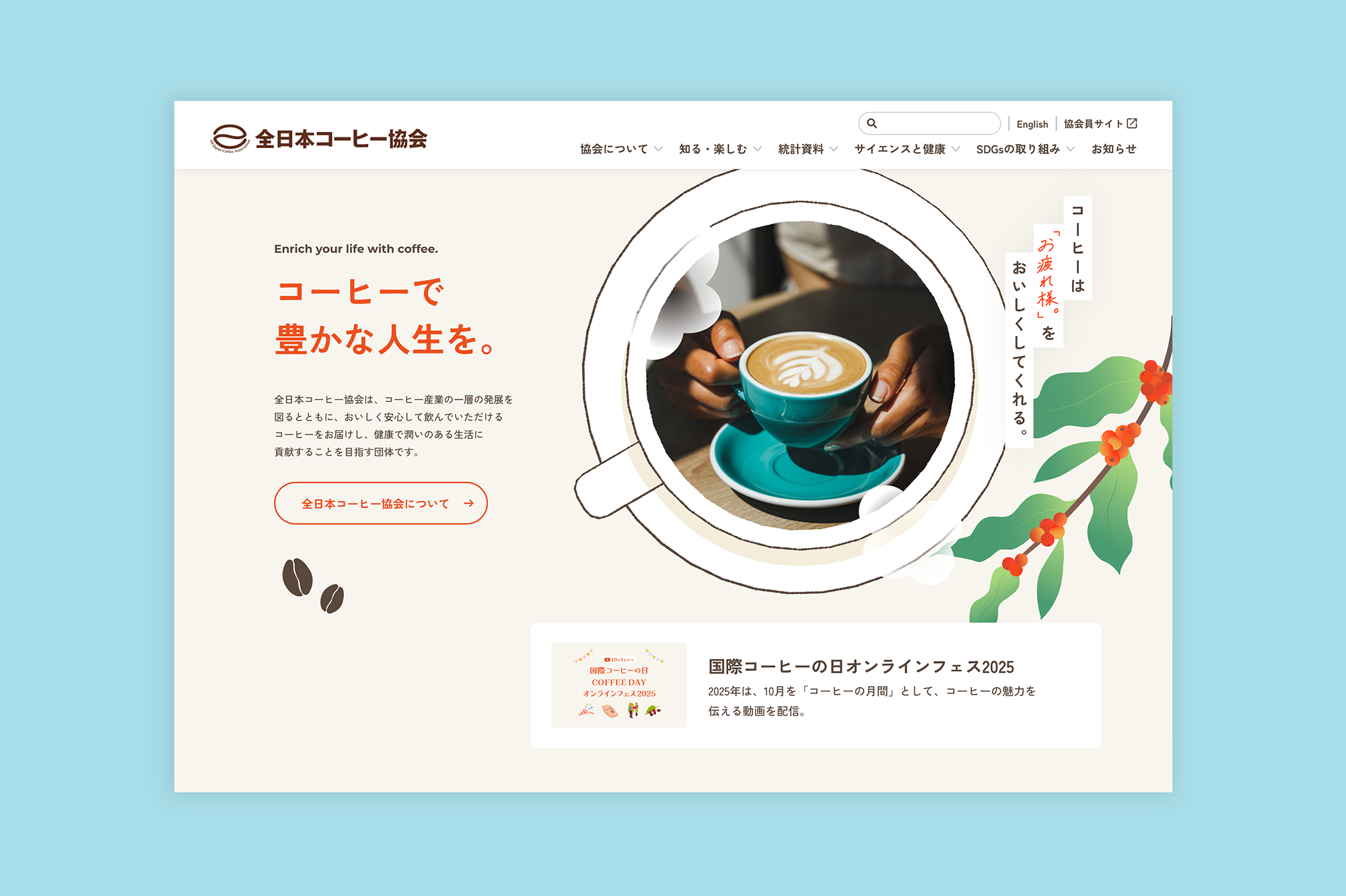 60年以上に渡って日本のコーヒー業界の発展と食生活の向上に寄与する活動を続けている一般社団法人全日本コーヒー協会の公式サイトをリニューアルしました。全日本コーヒー協会のサイトでは、国内のコーヒー事情だけでなく、世界の動向や科学的な調査データ等、様々なコーヒー関連の情報をコラムや統計データといった形でわかりやすく発信する活動を行っています。サイト利用者は、コーヒーの一般消費者から業界関係者、マスメディア、海外の関係団体など、幅広いユーザー層のニーズがあるサイトです。