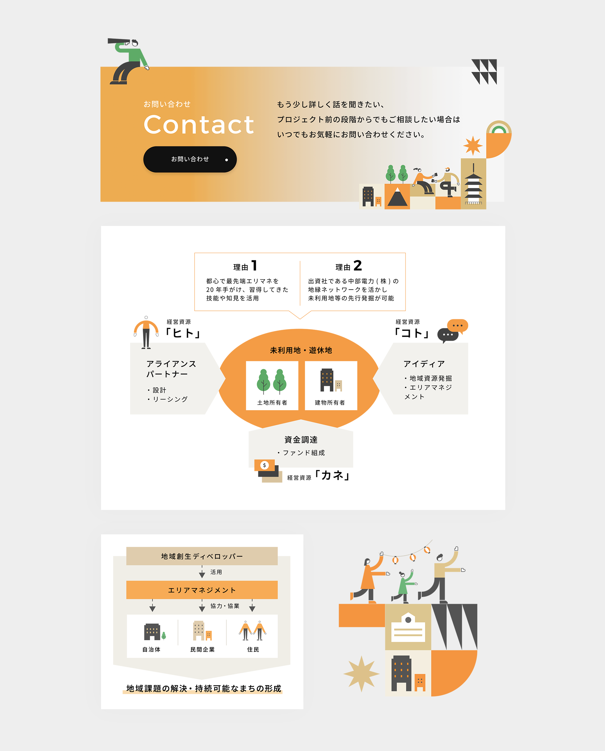 メインターゲット層に合わせ、洗練された現代的な雰囲気を大切にしながら、投資に値する企業としての信頼感が伝わることを重視しています。サイト全体はイラストを中心に構成し、内容の分かりやすさに加え、エリアマネジメントによって生まれる温かさや親しみやすさが伝わるようアプローチしています。